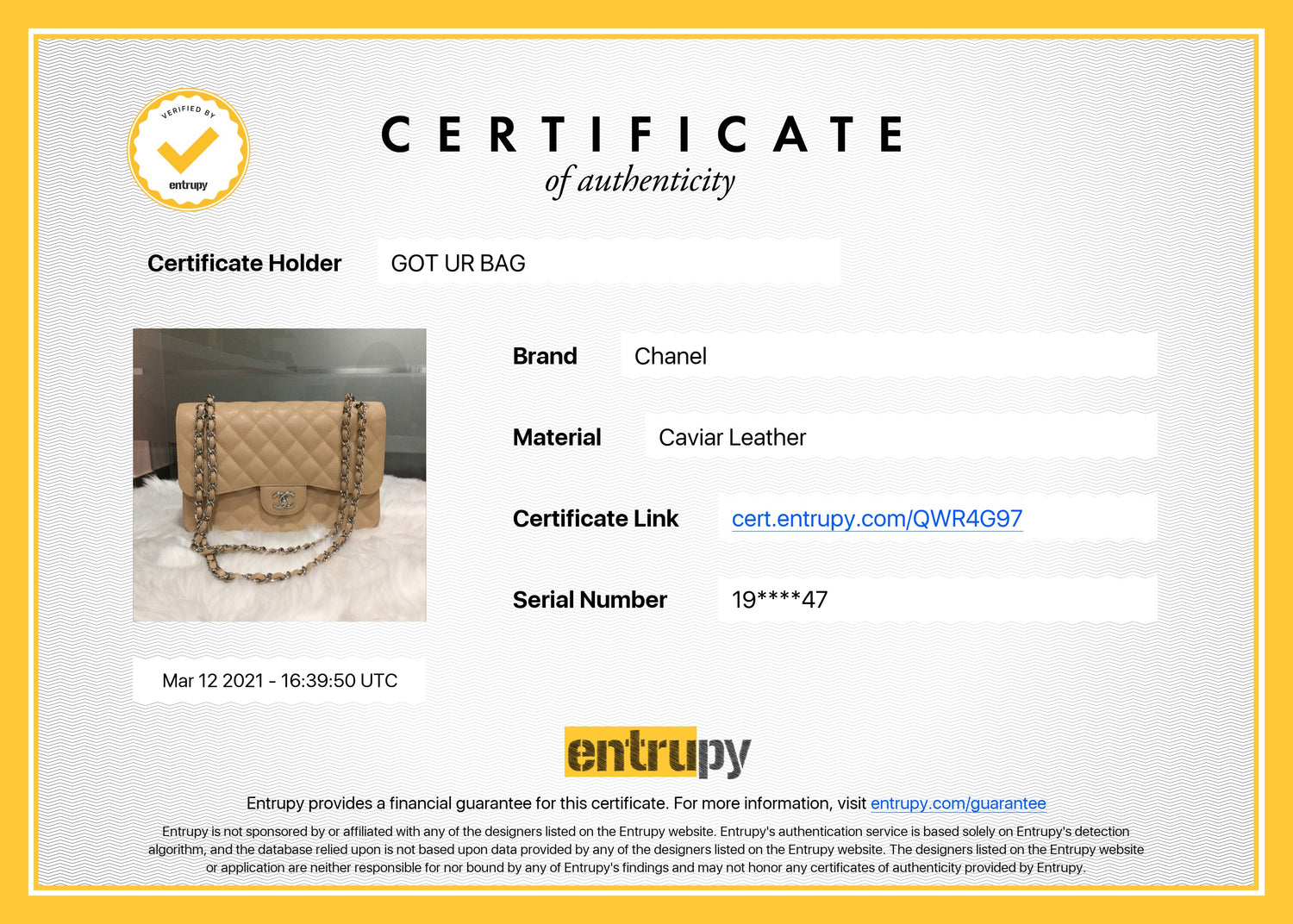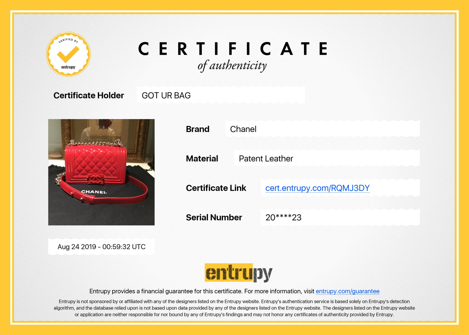 ¡Tu tranquilidad y confianza es muy importante para nosotros! Es por ello que además de autenticar las piezas que consignamos, ahora también brindamos la opción de obtener un certificado con garantía de Entrupy.