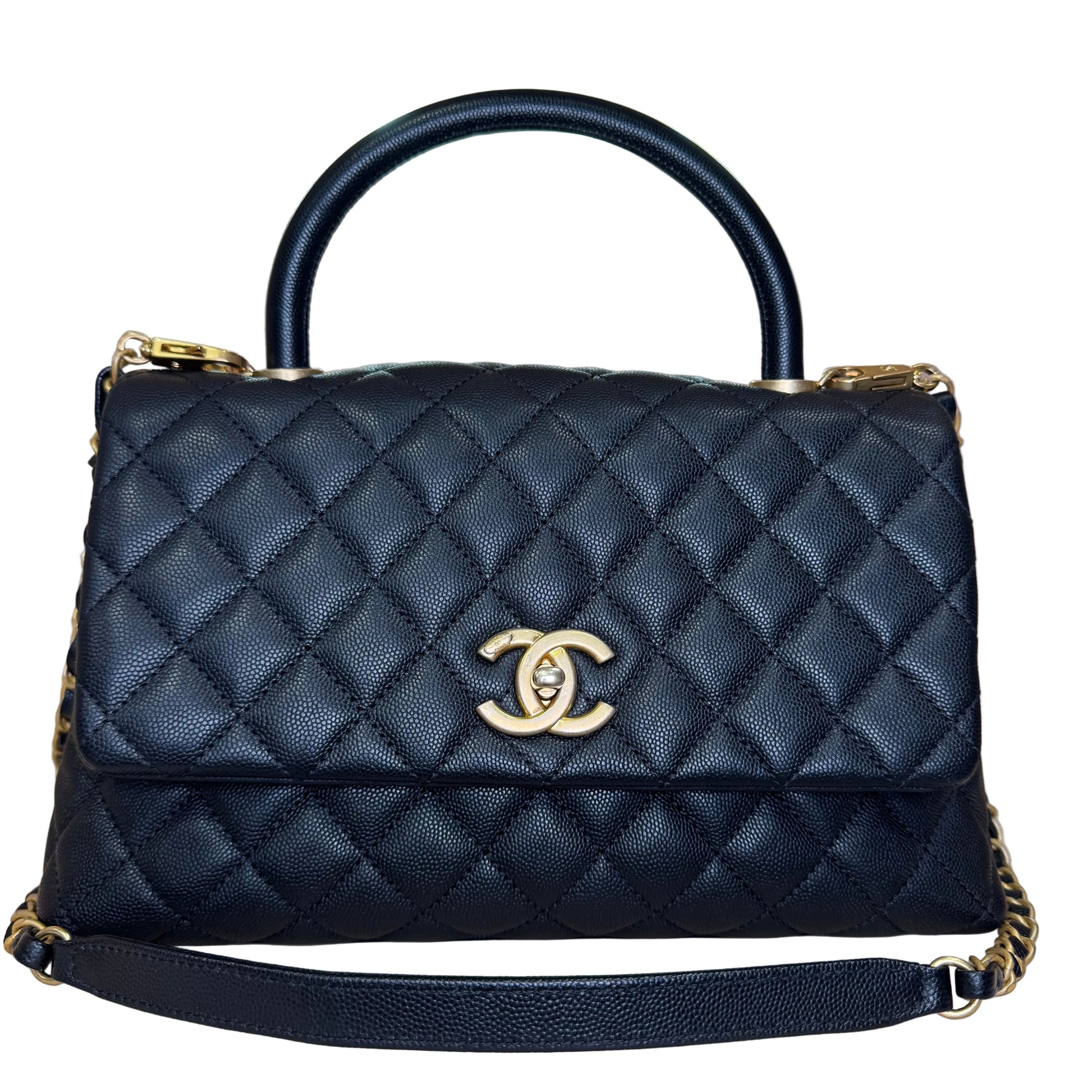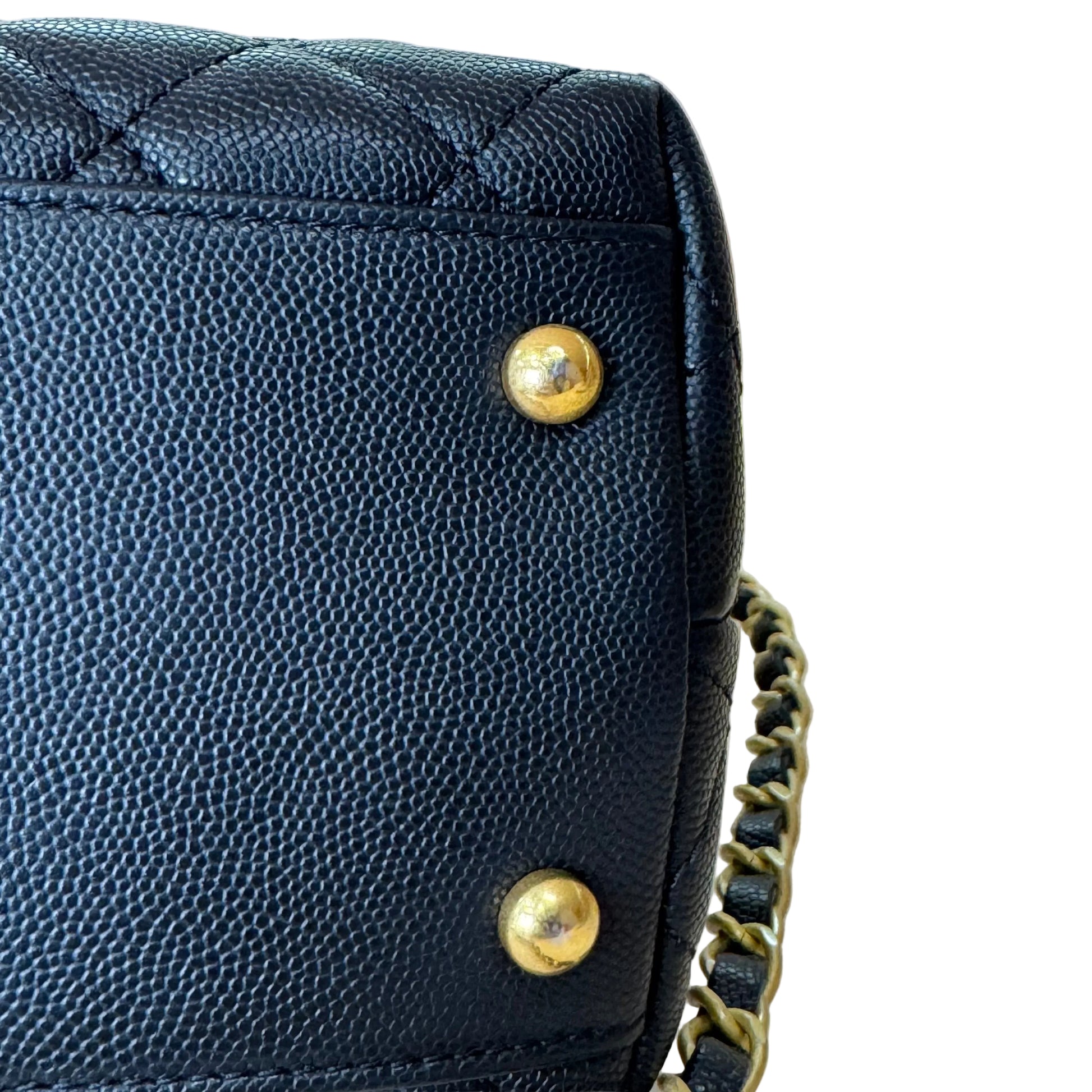 El icónico bolso Chanel Coco Flap combina elegancia atemporal con versatilidad funcional. Confeccionado en piel de becerro de primera calidad, presenta un acabado impecable que refleja lujo y sofisticación. El diseño mediano incluye un asa superior y una correa de hombro ajustable, permitiéndote llevarlo de múltiples formas según la ocasión. Los herrajes dorados complementan perfectamente la piel negra, creando un contraste refinado. Una inversión en un accesorio que trasciende tendencias y se adapta a cualquier guardarropa.