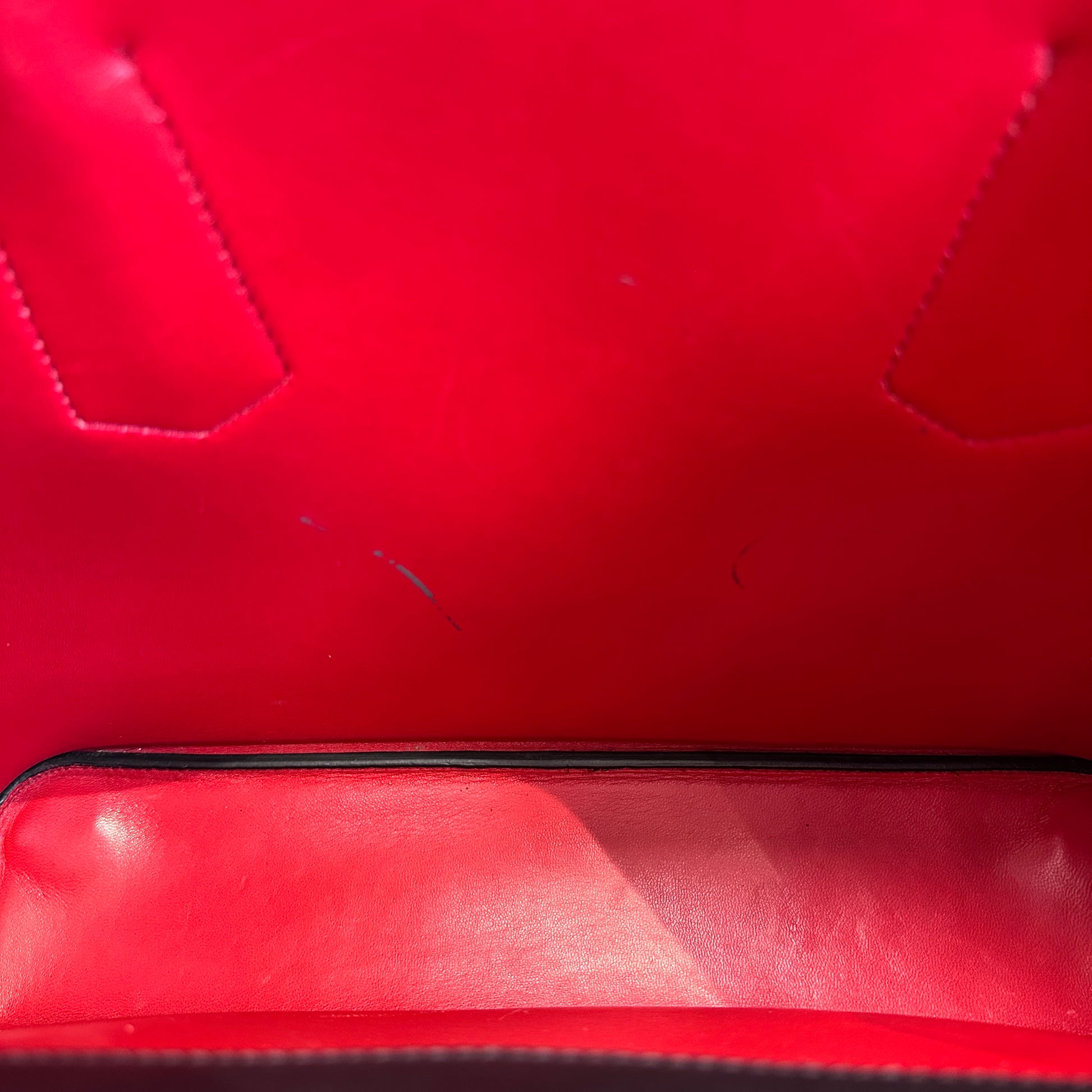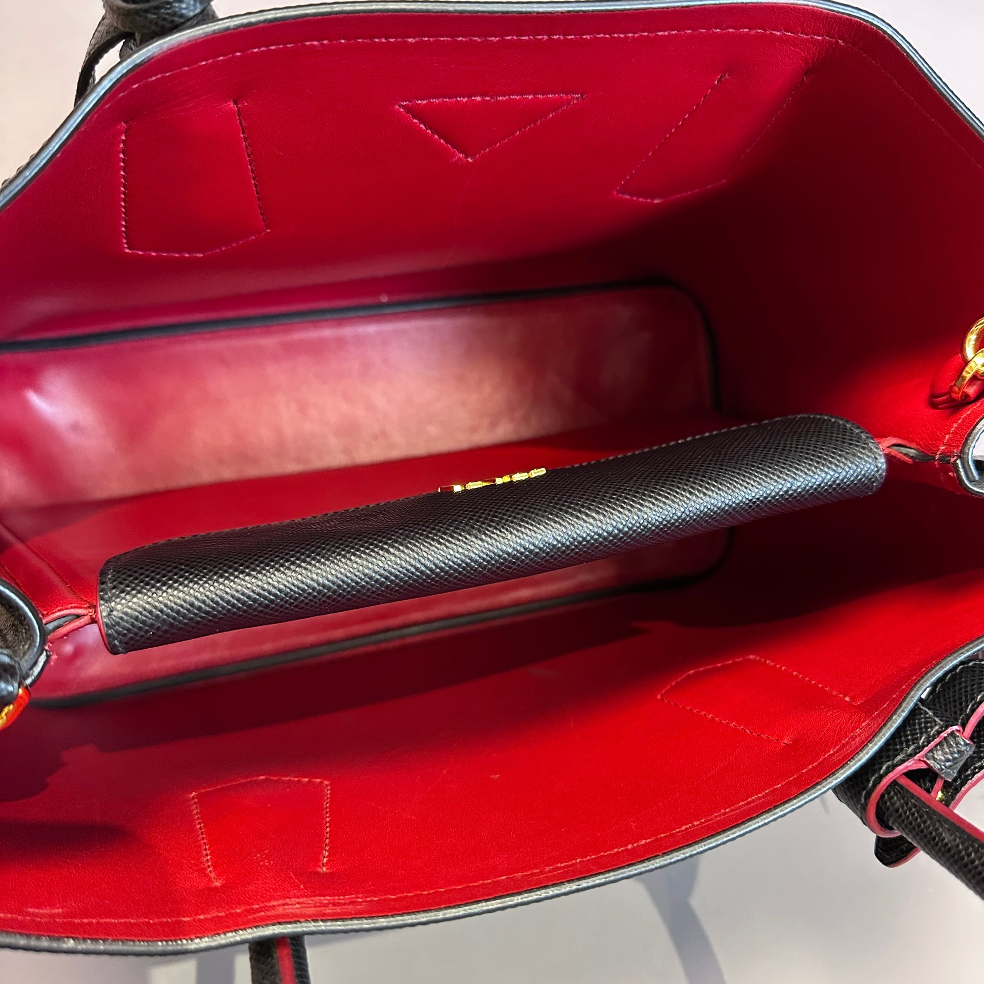 olsa Cuir confeccionada en cuero negro Saffiano con herrajes dorados e interior rojo que aportan un toque de lujo. Cuenta con correa ajustable para llevar crossbody para versatilidad en el uso. Su interior en cuero negro incluye un bolsillo azul funcional para organizar tus pertenencias. Tamaño mediano perfecto para el día a día, combinando sofisticación con practicidad.