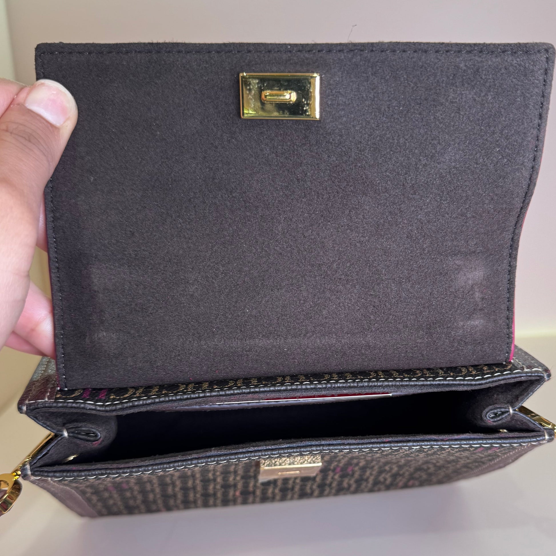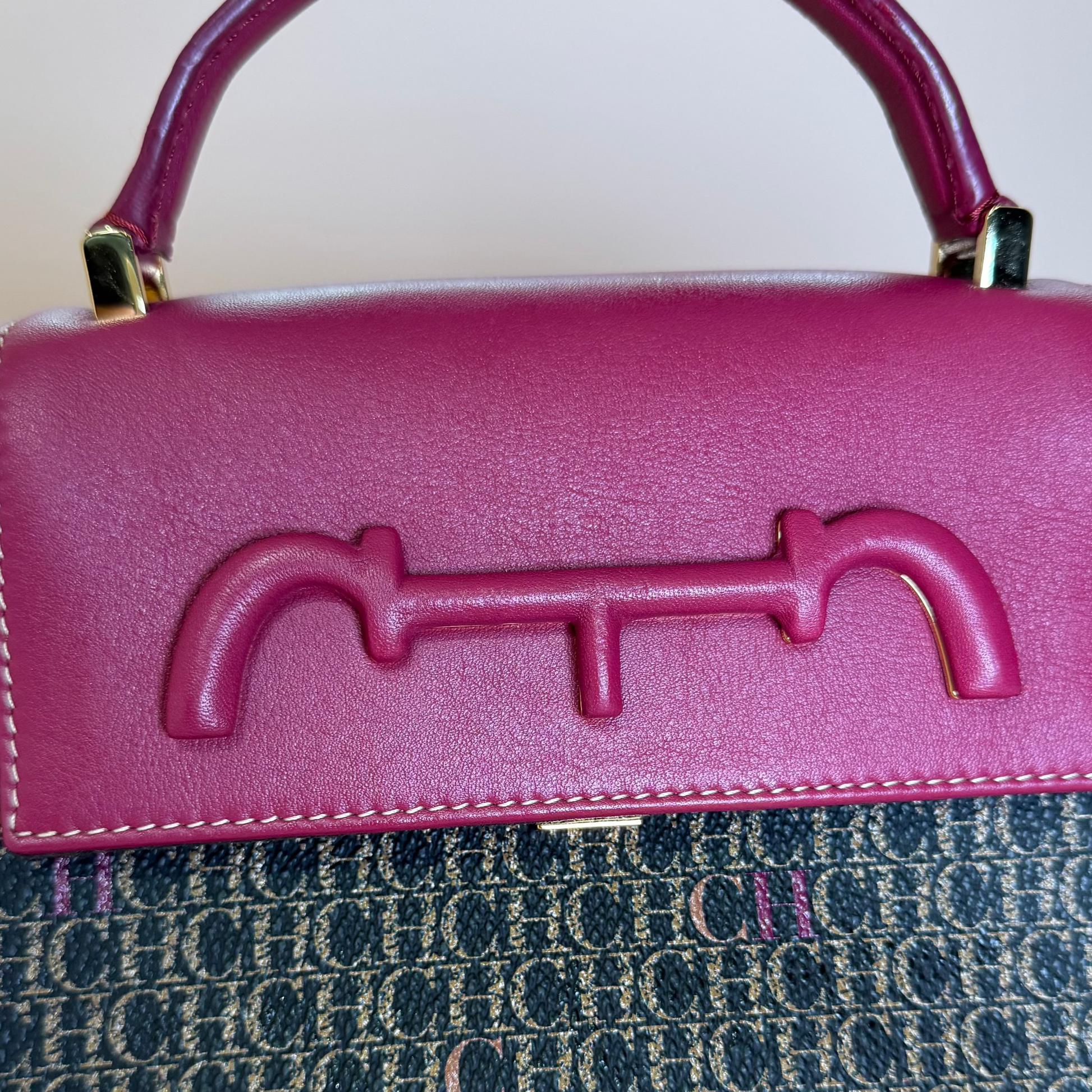 El bolso satchel Doma Insignia de Carolina Herrera, en cuero burdeos y lienzo marrón, destaca por su tamaño pequeño y diseño sofisticado. Cuenta con asa superior y una correa desmontable para cruzarlo, ofreciendo versatilidad y comodidad. Esta pieza combina materiales premium y funcionalidad, perfecta para quienes buscan un accesorio elegante, resistente y adaptable a diferentes estilos y ocasiones.