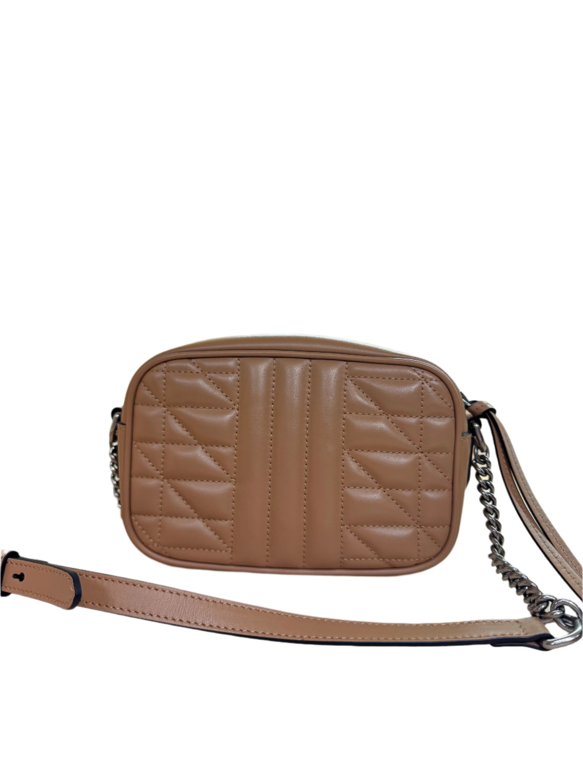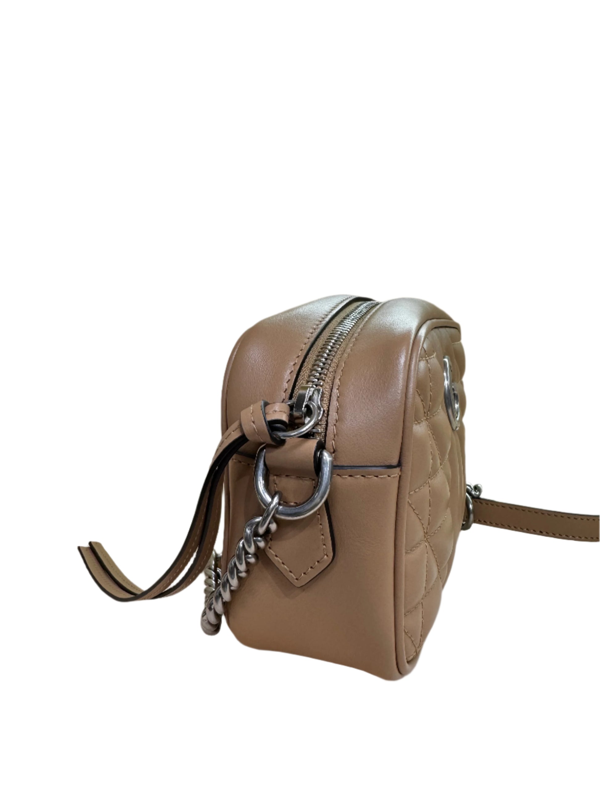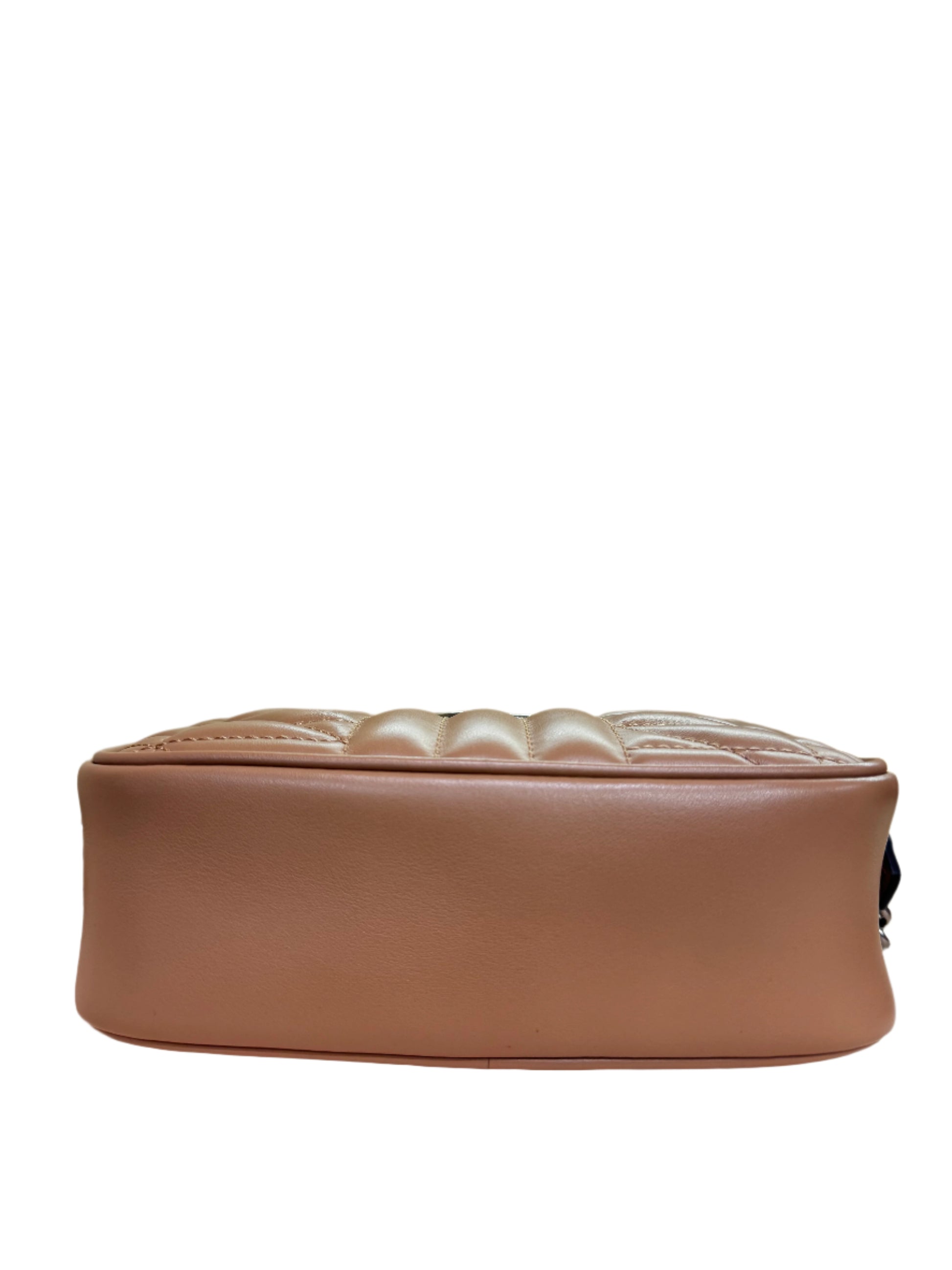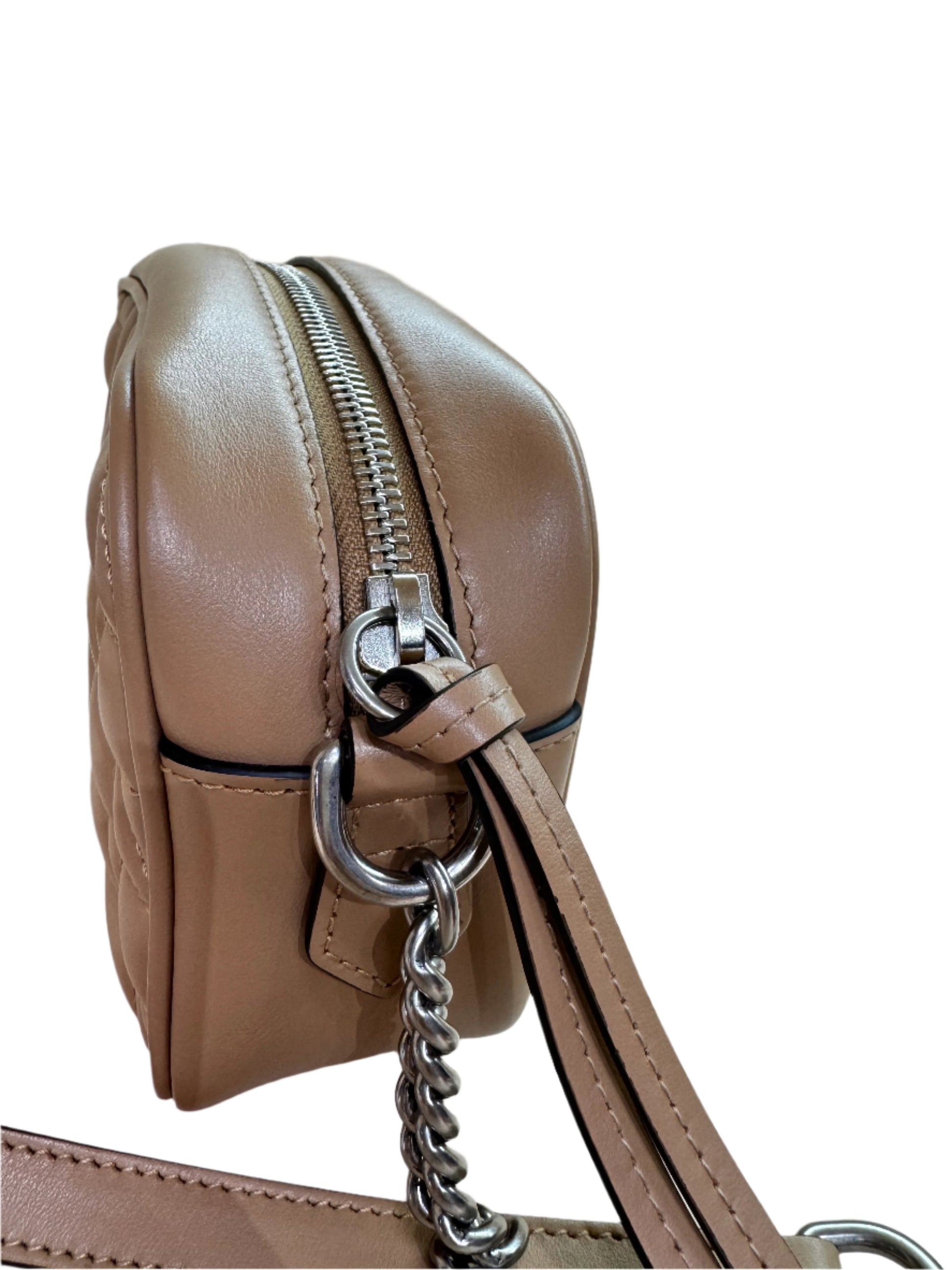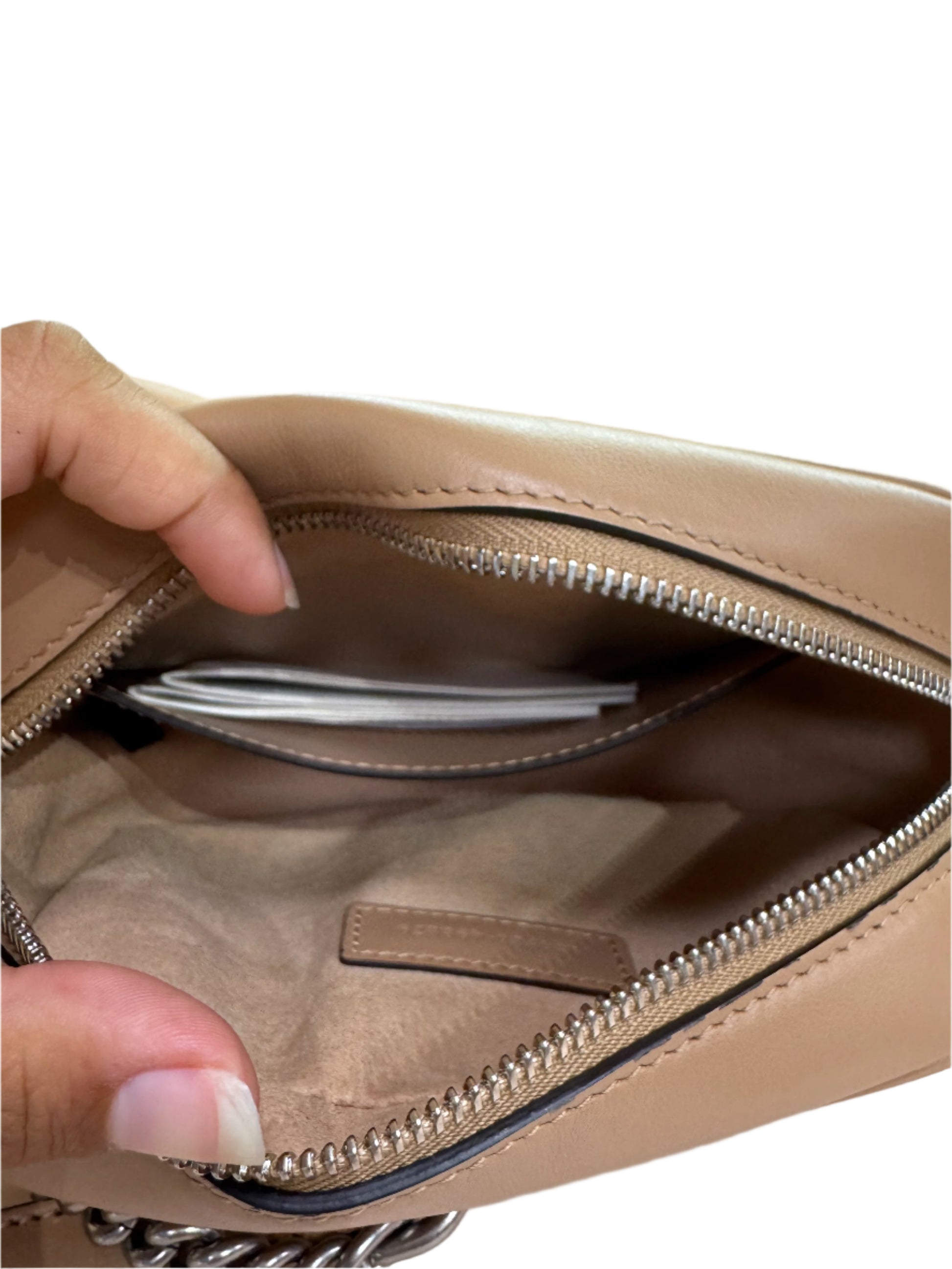 Esta elegante bolsa cruzada Marmont Mini de Gucci en tono nude es perfecta para llevar tus elementos esenciales de manera sofisticada. Con su diseño de cuero suave y detalle de doble G en la parte frontal, esta bolsa es ideal para cualquier ocasión, ya sea de día o de noche. Llévala al hombro o a través de tu cuerpo con su correa de cadena desmontable. ¡Haz una declaración de estilo con esta icónica bolsa!
