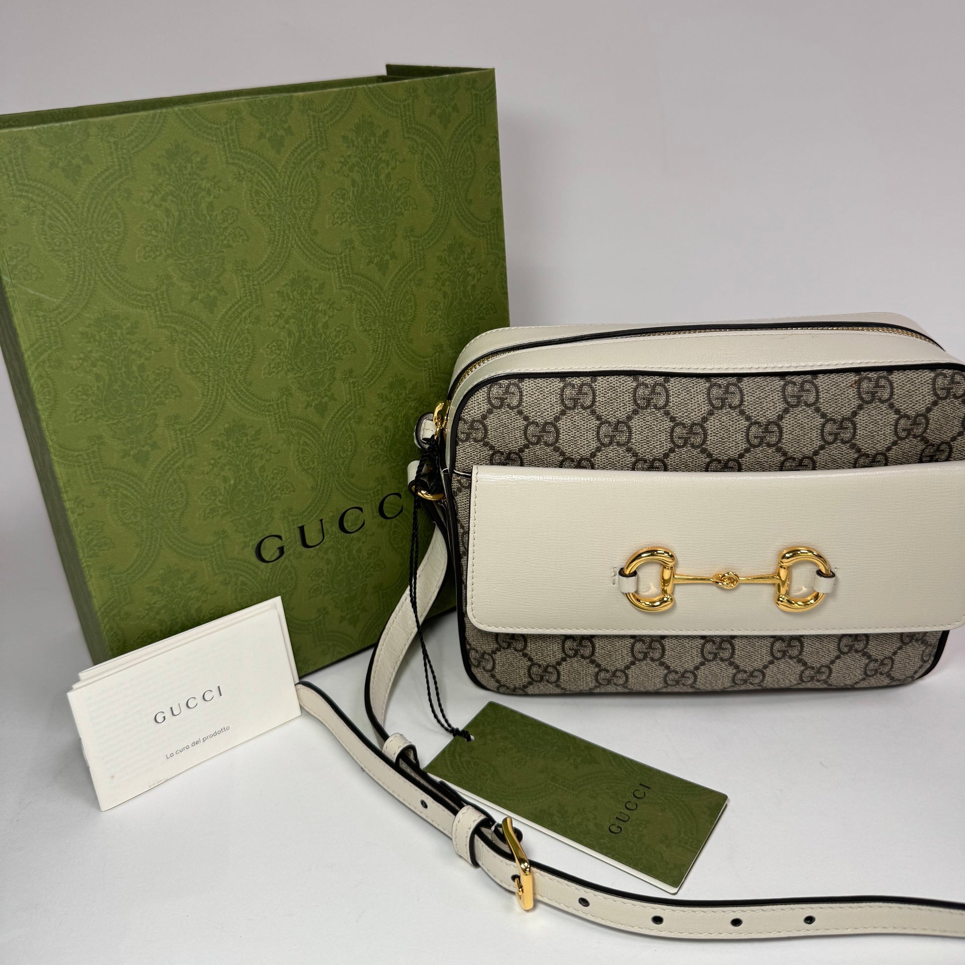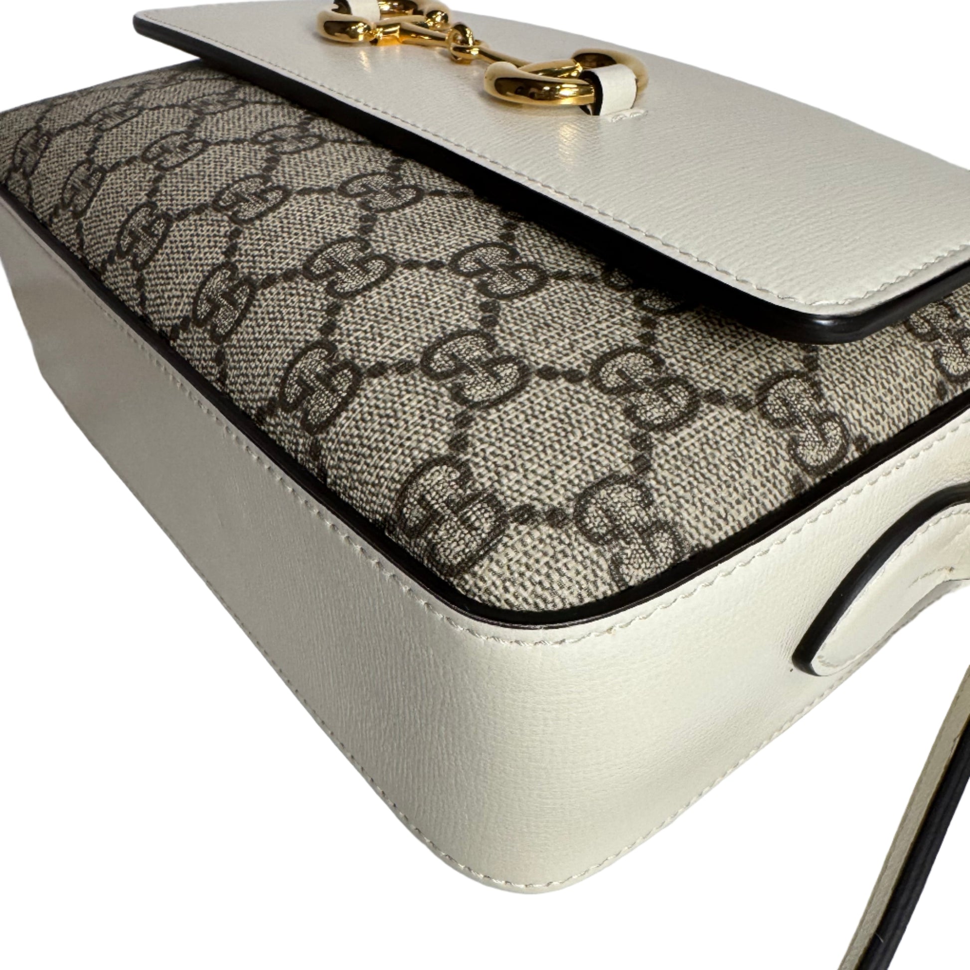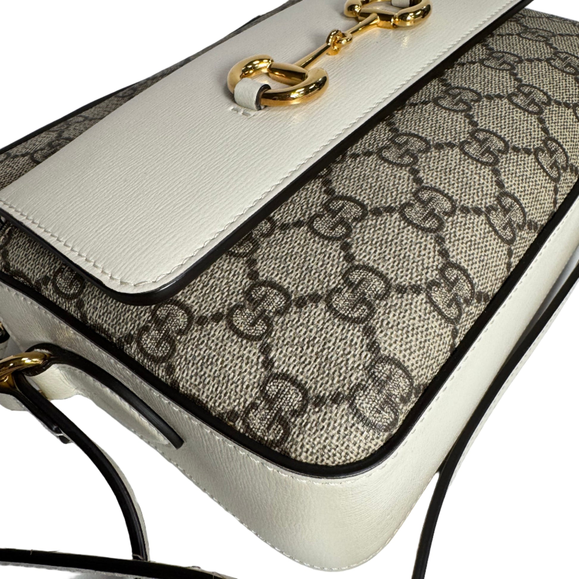 Este bolso Gucci Horsebit pequeño está elaborado en lienzo con detalles en cuero blanco y herrajes dorados que aportan un toque de lujo y distinción. Su diseño compacto y funcional, junto con la correa cruzada, facilita un uso cómodo y elegante. El emblemático cierre Horsebit en dorado destaca como símbolo de sofisticación, perfecto para complementar looks tanto casuales como formales con un estilo refinado y atemporal.