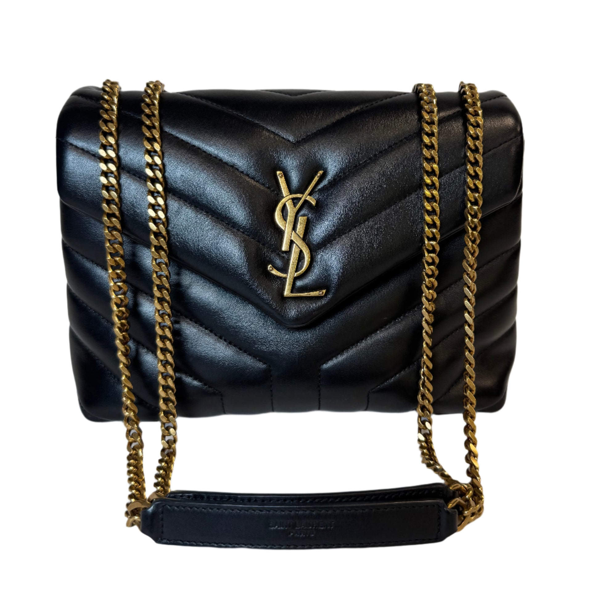 El Yves Saint Laurent LouLou Small en negro con herrajes dorados es un accesorio sofisticado que combina elegancia atemporal con un diseño funcional. Confeccionado en cuero suave, su silueta acolchada ofrece versatilidad para uso diurno o nocturno. El icónico logo YSL en tono dorado y la cadena aportan un toque de lujo, ideal para quienes buscan un estilo refinado y duradero.