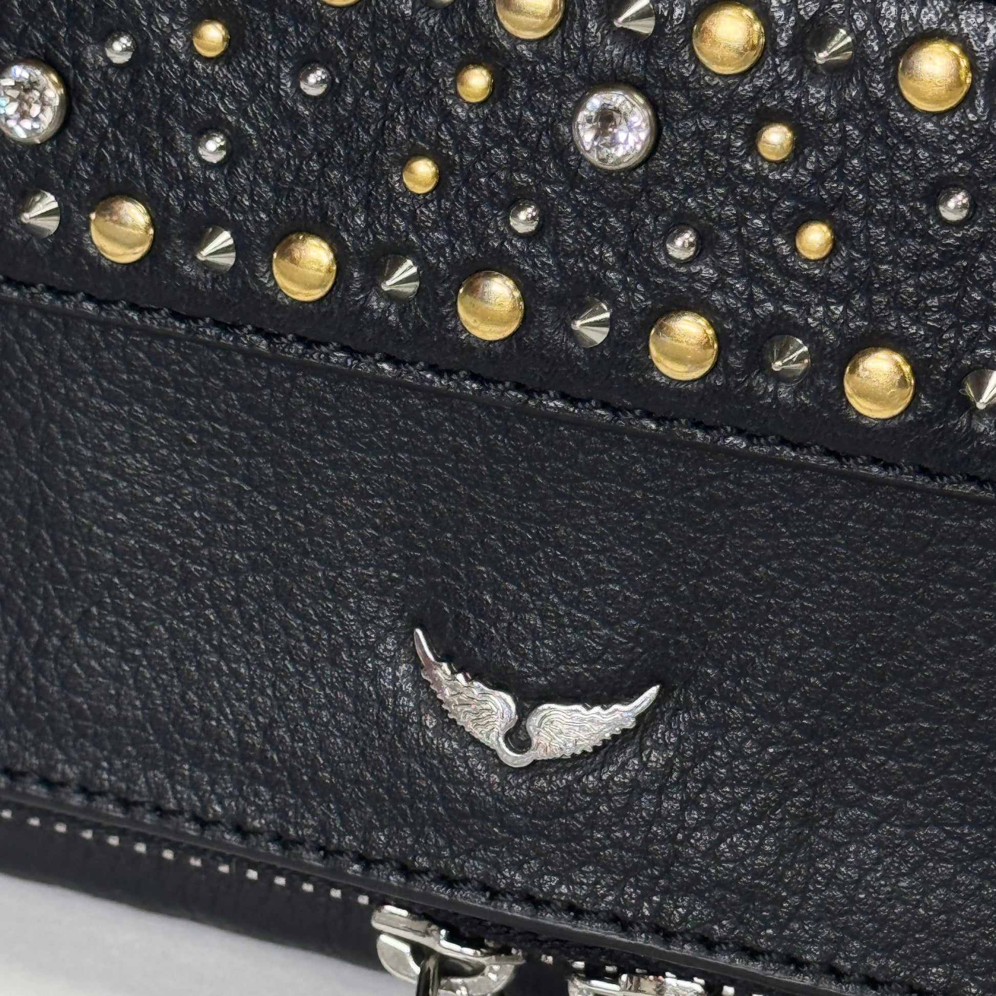 Este bolso Rock de Zadig & Voltaire que está en tendencia, elaborado con cuero color negro para combinar en eventos nocturnos, puedes llevarlo de 3 maneras ya que este modelo presenta un strap de hombro, un strap crossbody y una tira en frente para llevarlo como sobre, la misma tiene unos detalles de tachuelas en color dorado y rhine stones que hacen imposible pasar desapercibido este bolso. Los detalles de Dorado con la combinación de cuero y straps silver con cuero entrelazado lo hacen un bolso súper llamativo.