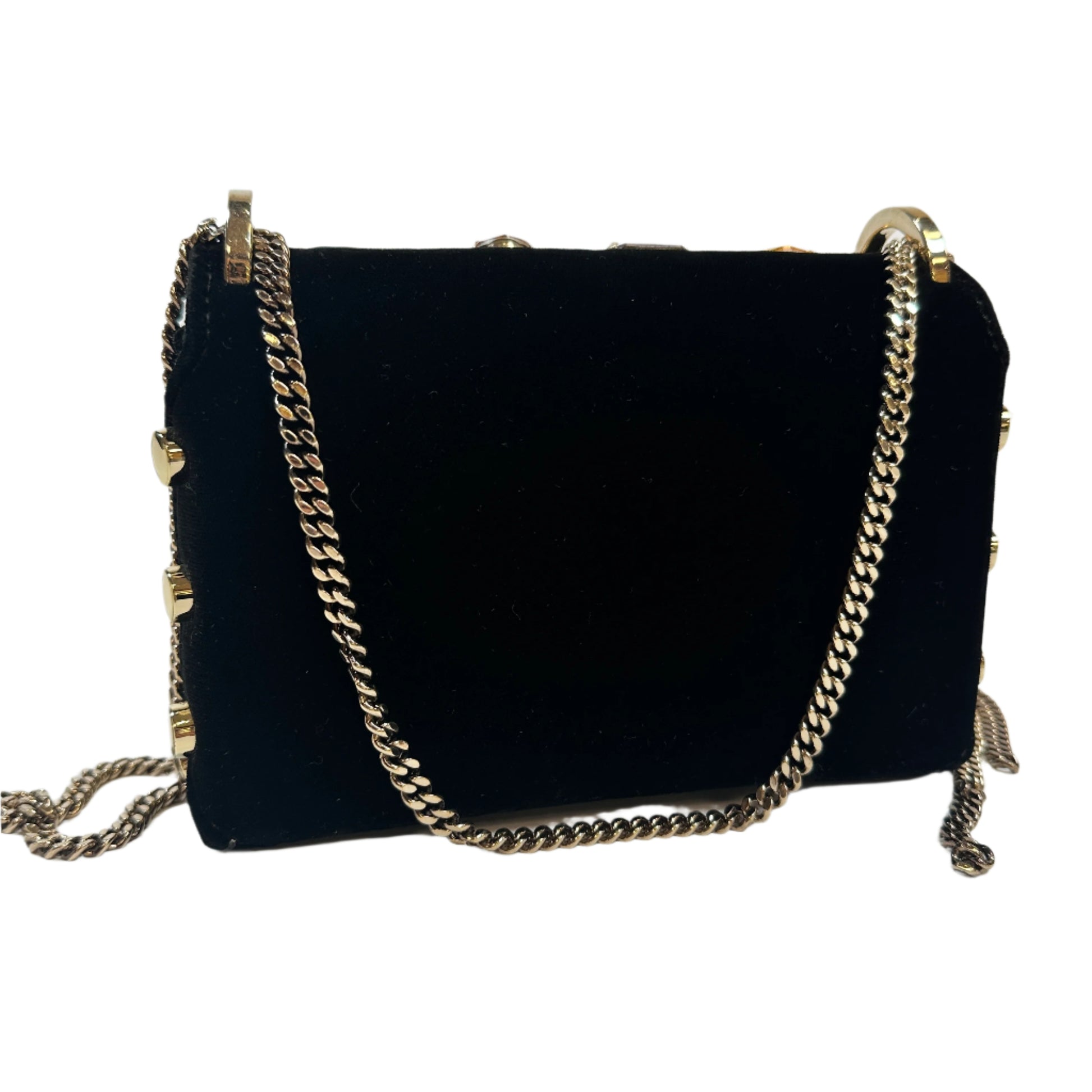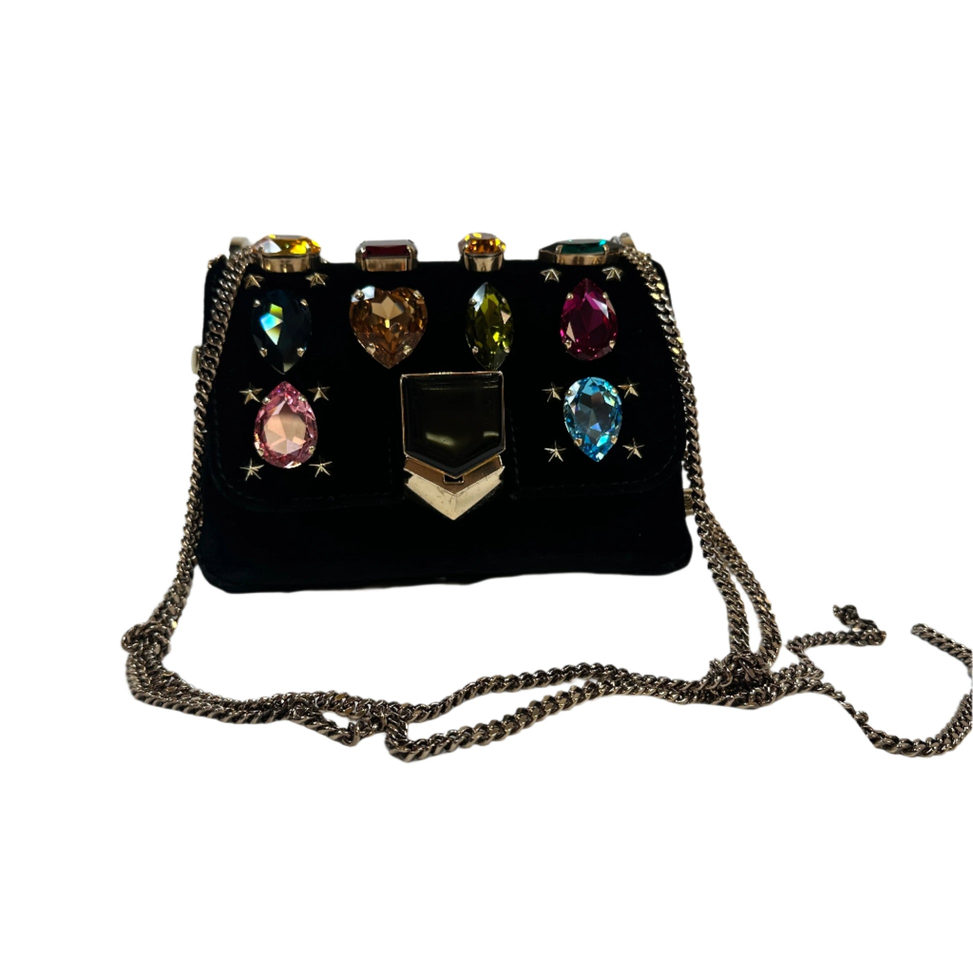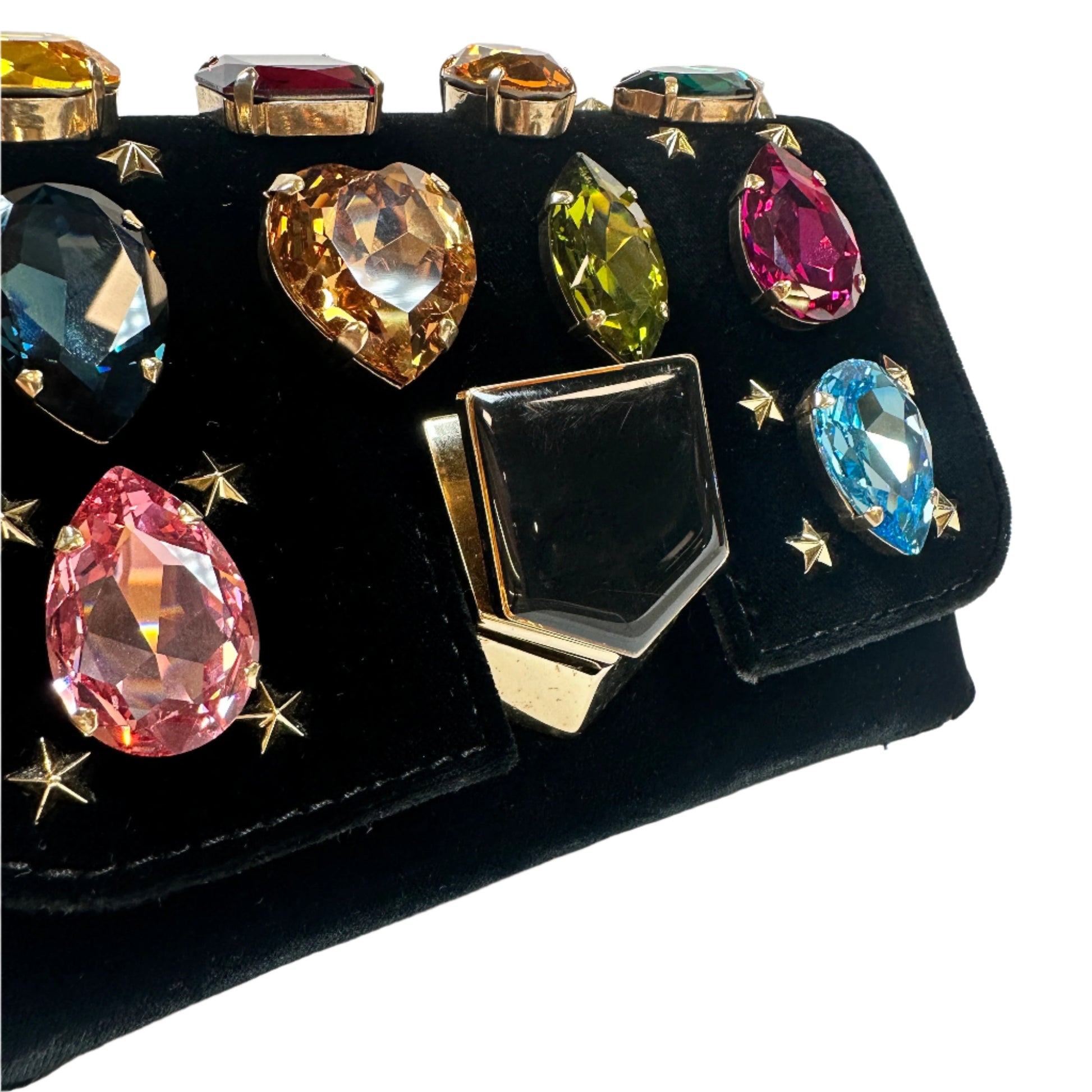 ¡Haz una declaración! Cautiva con la cartera Jimmy Choo Rocket Velvet Star Studded petite en terciopelo negro. Con adornos de estrellas doradas y una correa de cadena, esta cartera añade un toque de elegancia y estilo a cualquier atuendo. ¡Sé la estrella de la noche con esta pieza única!